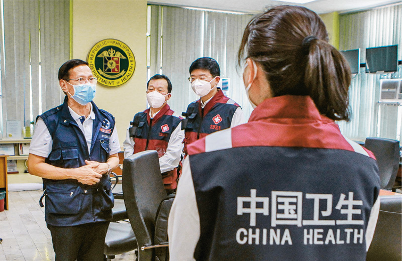 2020年4月6日,在菲律宾首都马尼拉,中国政府赴菲律宾抗疫医疗专家组成员与菲律宾卫生部长弗朗西斯科·杜克(左)进行交流。当日下午,中国援菲抗疫医疗专家组前往菲律宾卫生部,与菲卫生部官员就菲律宾疫情进行座谈。中国抗疫医疗专家组由国家卫生健康委员会组建,福建省选派,一行共12人,包括呼吸与危重症、中医、传染性疾病控制、微生物检验、护理等多个领域的专家。 新华社发 乌马利/摄