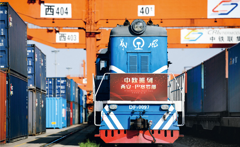 2020年4月8日,西安至巴塞罗那中欧班列在西安市新筑车站等待发车。 当日,满载50个集装箱太阳能板的75019次中欧班列从中国铁路西安局集团有限公司新筑车站驶出。这趟首开列车由陕西省西安市发往西班牙巴塞罗那,全程约12000公里。 新华社记者 李一博/摄